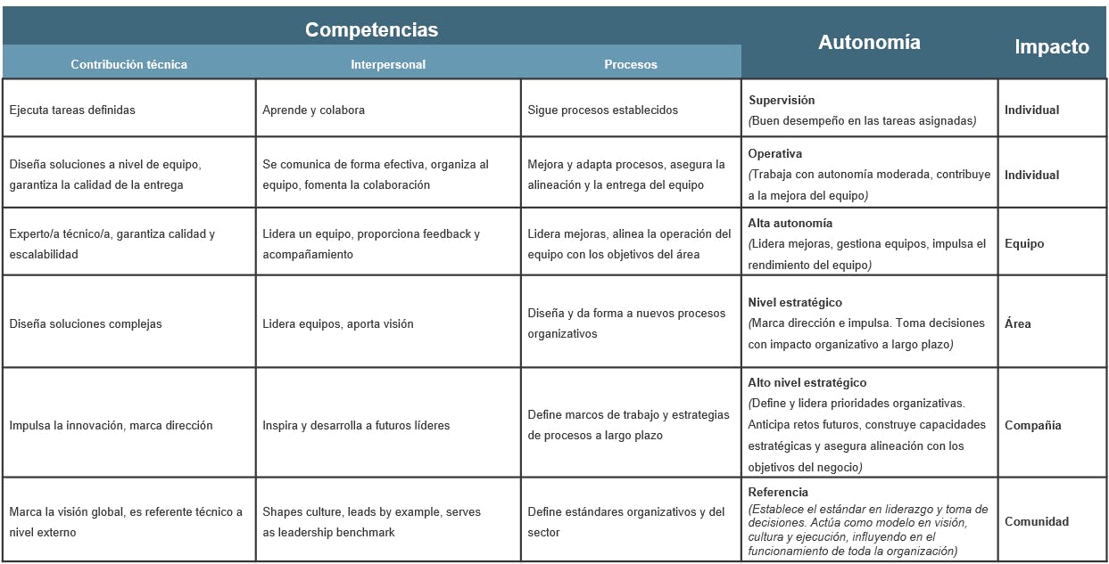 A medida que una persona avanza en su trayectoria dentro de una organización, no solo se espera una mejora en sus habilidades, sino también una evolución progresiva en el nivel de impacto que genera dentro de la organización.