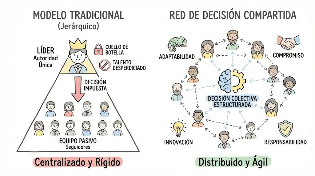 Durante mucho tiempo, los equipos han funcionado bajo modelos jerárquicos donde la toma de decisiones recae en muy pocas personas. Esto puede parecer ágil en ciertos contextos, pero a menudo deja fuera una enorme cantidad de talento, información y compromiso que vive en los equipos.